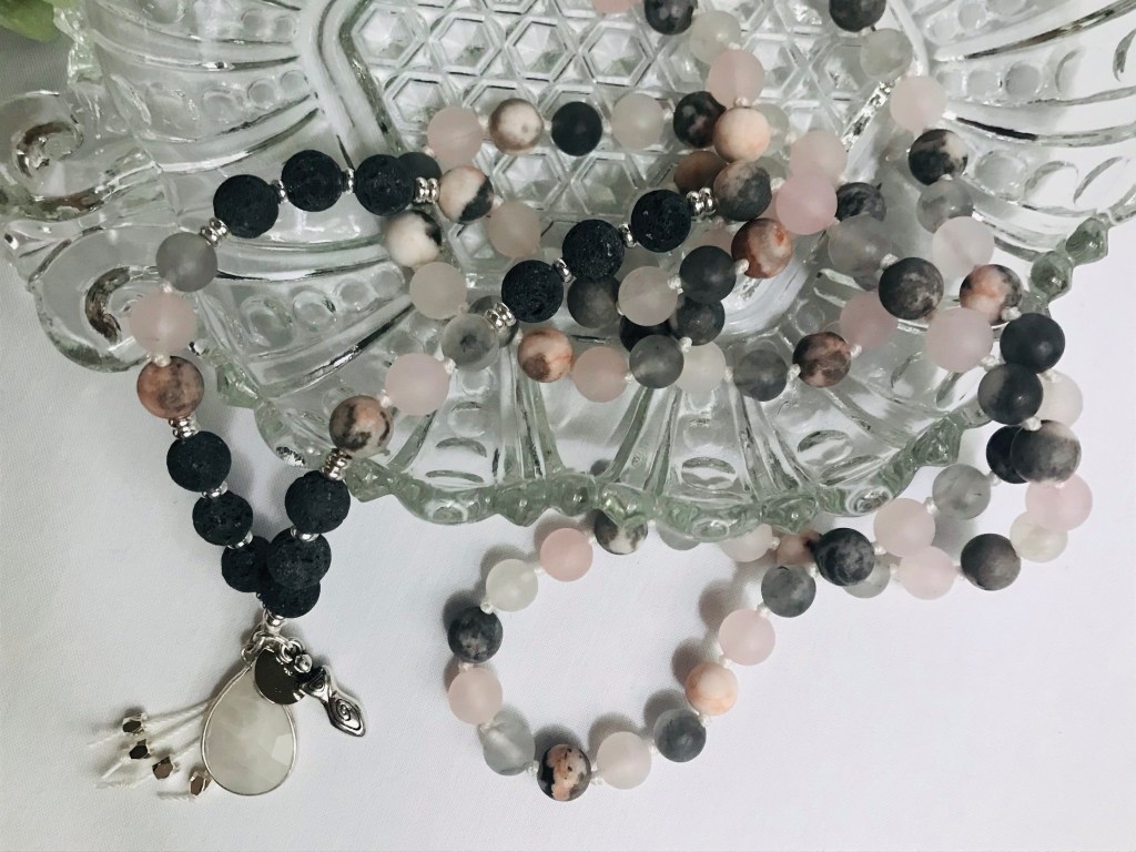 The Mother Mala* is designed with rose quartz, pink zebra, smoky quartz, lava rock, and moonstone. This mala celebrates the mother whose presence creates, comforts, blesses, sustains, and enriches all life and is a piece from the Mirlabella Collection.