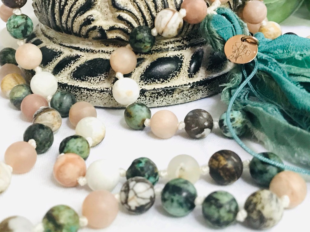 The Awakening Mala* is designed with peach moonstone, African turquoise and petrified wooden opal. This mala is inspired by the essence of spring and is a piece from the Seasons Collection.